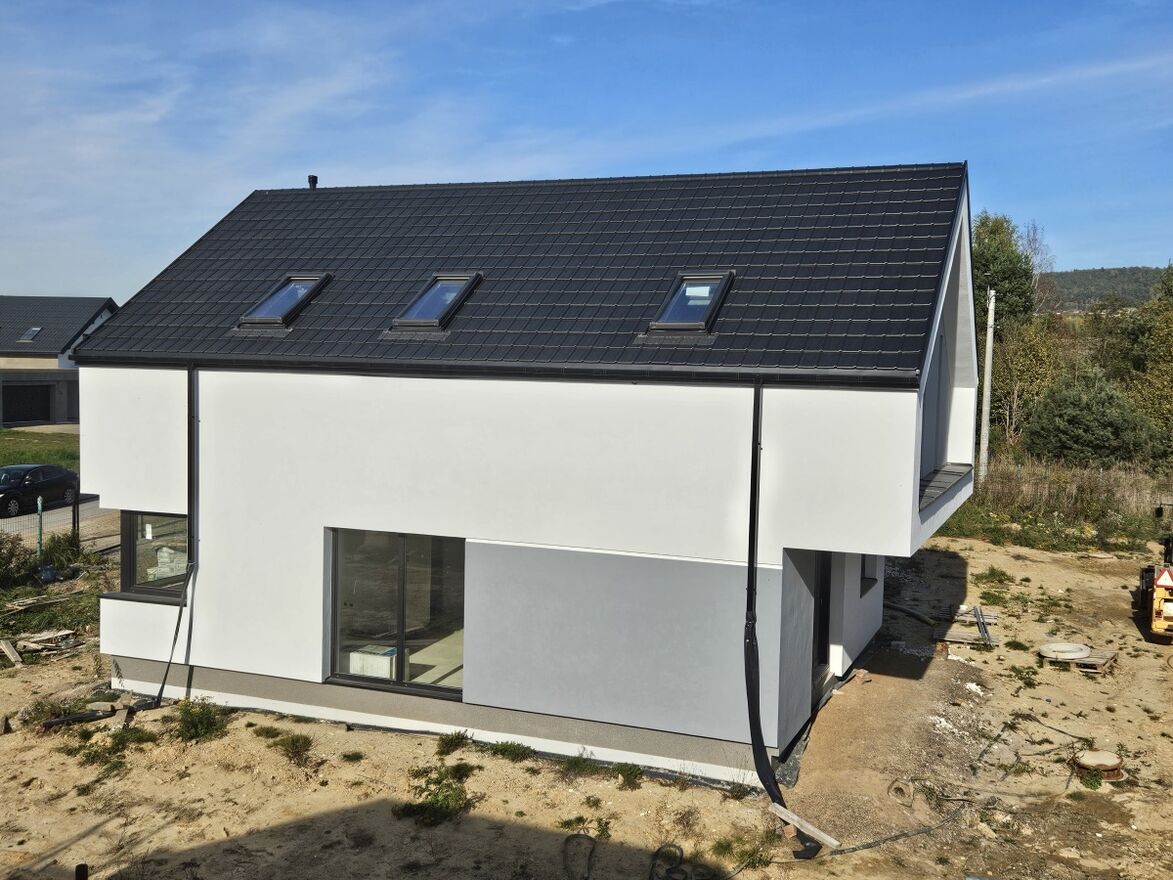 ściany nośne wymurowane z betonu komórkowego h+h gr.24cm. Trzpienie konstrukcyjne, schody oraz strop nad parterem wykonane w technologii żelbetowej monolitycznej z betonu C20/25. Ocieplenie ścian zewnętrznych to 20cm styropian grafitowy (lambda 0,31W/mK) + elewacja zewnętrzna wykonana produktami marki Mapei.